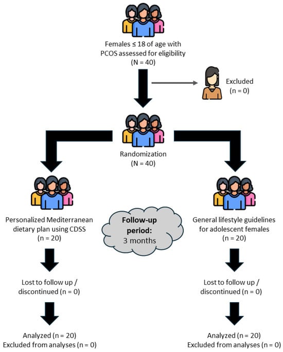 All volunteers were outpatients of the IASO HOSPITAL in Athens, Greece. The initial recruitment of adolescents with PCOS was conducted through written announcements at the clinic facilities and the hospital’s official website. Female participants, who expressed their willingness to take part, attended personal meetings with the appointed dietitians who provided comprehensive explanations on the objectives, methods, and the possible benefits and risks of the trial. All patients were given a pamphlet containing relevant information. Prior to the commencement of the recruitment process, every eligible volunteer, and their guardian, executed an informed written agreement and subsequently retained a physical copy of the executed document. All eligible patients were from Athens (Greece) and were recruited in December 2019.