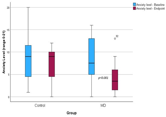 Finally, the assessment of psychological well-being using the HADS scale is displayed in Figure 2. The MD group experienced a statistically significant reduction in anxiety levels (8.5 ± 4.9 vs. 4.1 ± 3.4, p < 0.001), whereas no statistically significant reduction was observed in the Control group (8.8 ± 4.9 vs. 7.2 ± 3.6, p = 0.079). As depicted, at the trial endpoint, anxiety levels significantly decreased in the MD group compared to the Control group (4.1 ± 3.4 vs. 7.2 ± 3.6, p = 0.004).