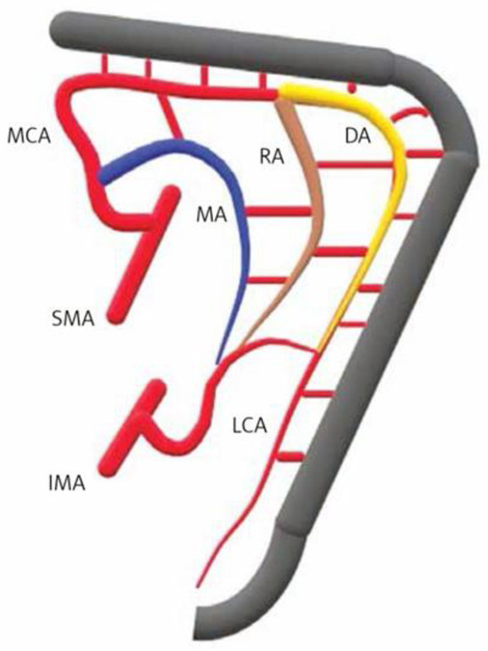Collateral vessels at the splenic flexure: Drummond artery (DA), Riolan’s arch (RA), and Moskowitz artery (MA) ensuring connection between the superior (SMA) and inferior (IMA) mesenteric artery watersheds. LCA—left colic artery; MCA—middle colic artery. Reprinted from [51].