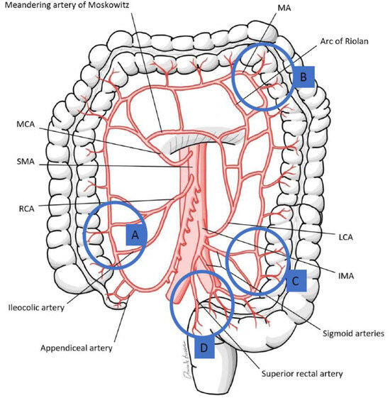 Variability of the marginal artery (MA): (A) MA inconsistently present in right colon (B) MA can be absent at Driffith’s point (watershed area between SMA and IMA branches) (C) MA can be absent at Driffith’s point (watershed between the SMA and IMA branches); and (D) MA can be absent at Sudeck’s point (watershed area between the last sigmoid artery and superior rectal artery. Modified from [50].
