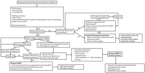 Respiratory manifestations associated with rare inherited metabolic disorders may be part of a constellation of symptoms indicating an underlying multisystemic disease, such as LSDs. Mild phenotypes of LSDs, characterised by late onset and less severe organ involvement, may be misdiagnosed or remain undiagnosed. A pulmonologist should be able to raise suspicion of a rare disease through history and objective examination when faced with a patient exhibiting recurrent respiratory symptoms. A flow chart outlining the main clinical signs and recommended investigations for the differential diagnosis of LSDs is provided in Figure 2.
