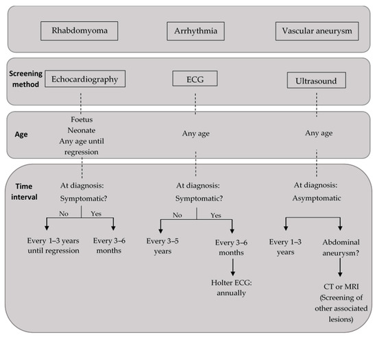 Regarding cardiac long-term surveillance, asymptomatic paediatric patients should be evaluated every 1 to 3 years by an echocardiogram until regression of cardiac rhabdomyomas, whereas a more frequent assessment might be necessary for symptomatic patients. For asymptomatic patients of all ages, it is recommended to perform an ECG every 3 to 5 years to monitor for conduction defects or to perform a 24- to 48-h Holter monitoring in symptomatic patients [1,45].