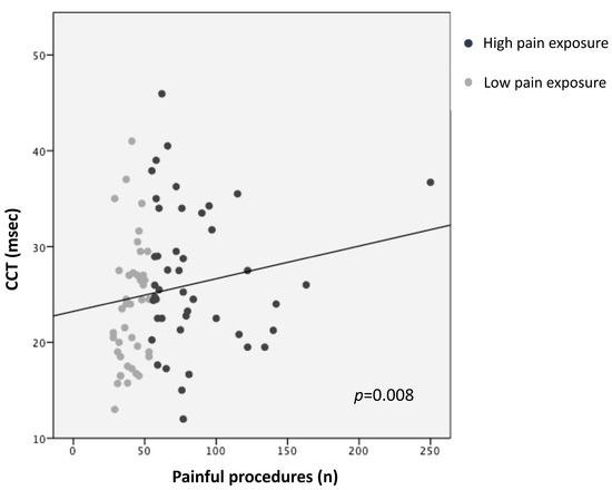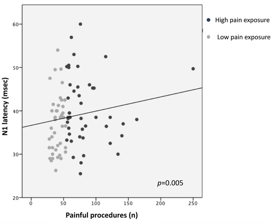 SEP responses allow direct evaluation of the whole neural pathway from the skin through the thalamus to the cortex. These responses primarily depend on the development of thalamo-cortical connections in infants, with the N1 latency reflecting the functional integrity of the somatosensory pathway in the nervous system. In fact, in cases of damage to the thalamocortical projections, the N1 peak (latency) could be absent or delayed [29]. Thus, our findings of longer central latencies in more pain-exposed infants might be the reflection of an altered maturation or an injury of the thalami and/or of the thalamo-cortical connections.