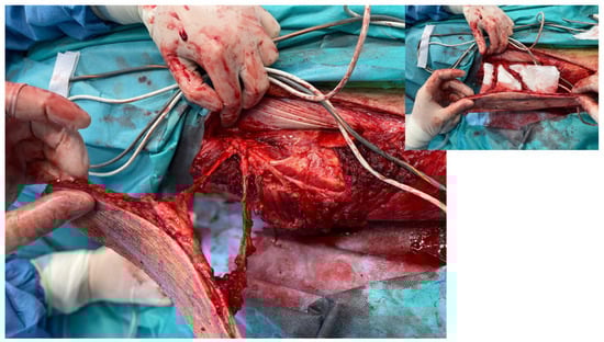 Harvesting of the gracilis flap is different. The preoperative design of the flap is based on a line joining the pubic tubercle with the medial tibial condyle (the posterior borer of the flap is the adductor longus, which is easily recognized during adduction of the leg). The length of the flap is usually not more than 15 cm, and width is around 7 cm. After dissection of the whole muscle, the pedicle was transferred in the large subcutaneous tunnel. Again, the flap donor site was primarily closed.
