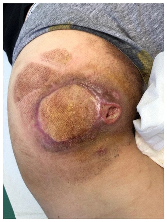 No complications were reported at the donor site (Figure 8). However, we observed one partial necrosis of the flap (Figure 9) and partial wound dehiscence in three patients (it was treated conservatively and with hyperbaric therapy (Figure 10)). All flaps survived (100%). The recurrence rate was 9.01% (1/11). Another surgery was performed in one female patient due to a recurrent pressure ulcer probably caused by seroma (Figure 11). This recurrence was reported during the 5-year follow-up and the surgical procedure was performed after 11 months. Therefore, the chosen intervention was a pedicled anterolateral thigh (pALT) fasciocutaneous flap reconstruction for the ischial ulcer via a subcutaneous route.