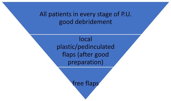 Apart from surgical debridement and subsequent granulation, pressure ulcers refractory to nonoperative treatment may undergo flap reconstruction.