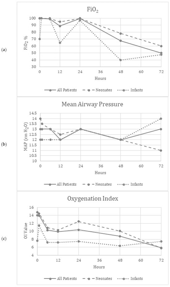 The following supporting information can be downloaded at: https://www.mdpi.com/article/10.3390/children11060703/s1, Figure S1a–e depict changes in FiO2, mean airway pressure, oxygenation index, mean blood pressure and heart rate in patients who did not need ECMO (continuous lines vs patients who needed ECMO (dotted line). The trends on patients who did not need ECMO are similar to all patients depicted in Figure 1. These values become not relevant once patients are placed on ECMO.
