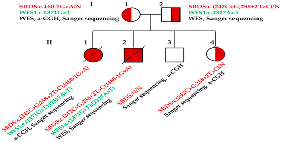 Parental Whole Exome Sequencing (WES) (performed in Dante Labs, New York, NY, USA, with an Illumina sequencer with the BGI exome kitV459M (BGI, Yantian District, Shenzhen, China)) reported heterozygosity for the SBDS:c.258+2T>C pathogenic variant in the paternal sample and no pathogenic variants in the mother; CGH on the maternal sample had apparently excluded pathogenic CNVs. Bioinformatic re-analysis of the WES (.vcf) files in a second private genetics laboratory in Greece confirmed the previous variant on the paternal sample, and additionally detected the heterozygous pathogenic variant SBDS:c.460-1G>A in the maternal sample. Of interest, SBDS:c.460-1G>A, a pathogenic variant first recorded in 2005 [31], was not listed in the ClinVar database before 2020. The variant presents with a relatively high prevalence (5 of 12 cases, 41.66%) in the Greek population, [9] but, to the best of our knowledge, it was never detected in homozygosity or compound heterozygosity with SBDS:c.183_184delTAinsCT [8,9,10]. Upon the referral of the second child (II-2) to the Laboratory of Medical Genetics, University of Athens, parental samples and DNA from proband II-1 were requested along with the previous (.vcf) files.