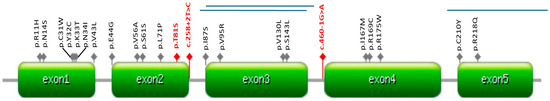 - Richards, S.; Aziz, N.; Bale, S.; Bick, D.; Das, S.; Gastier-Foster, J.; Grody, W.W.; Hegde, M.; Lyon, E.; Spector, E.; et al. Standards and guidelines for the interpretation of sequence variants: A joint consensus recommendation of the American College of Medical Genetics and Genomics and the Association for Molecular Pathology. Genet. Med. 2015, 17, 405–424. [Google Scholar] [CrossRef] [PubMed]