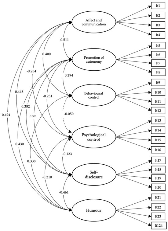 In addition to the evidence of construct validity, the average variance extracted (AVE) was evaluated, and favourable results were obtained for all factors, namely humour (AVE = 0.75), behavioural control (AVE = 0.56), affection and communication (AVE = 0.72), promotion of autonomy (AVE = 0.67), self-disclosure (AVE = 0.63), and psychological control (AVE = 0.52), and an adequate value was obtained for the maximum shared variance discriminant validity (MSV = 0.62).