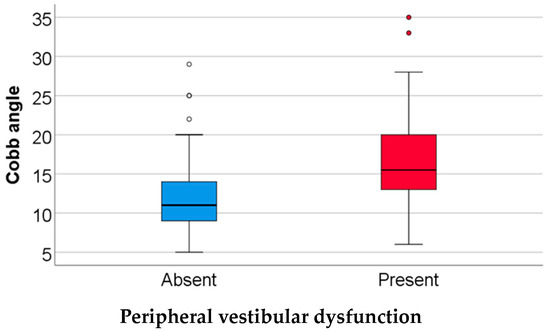 Data from Table 3 and Figure 1 show the comparison of the Cobb angle according to the existence of peripheral vestibular dysfunction instrumental diagnosis. The distribution of the Cobb angle was non-parametric in both groups, according to the Shapiro–Wilk test (p < 0.05).