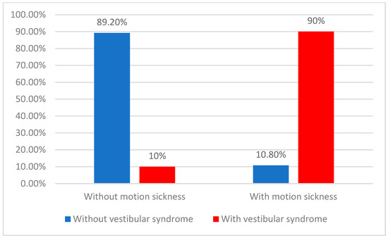 Data from Table 5 and Figure 3 show the distribution of patients according to the existence of motion sickness and an instrumental diagnosis of peripheral vestibular dysfunction. Differences between groups were statistically significant according to the Fisher’s Exact Test (p < 0.001); patients with motion sickness were significantly more associated with peripheral vestibular dysfunction (90% vs. 10.8%), and patients with motion sickness had increased odds of having peripheral vestibular dysfunction by 74.4 times (95% C.I.: 15.696–352.652).