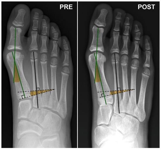 - Condon, F.; Kaliszer, M.; Conhyea, D.; O’ Donnell, T.; Shaju, A.; Masterson, E. The First Intermetatarsal Angle in Hallux Valgus: An Analysis of Measurement Reliability and the Error Involved. Foot Ankle Int. 2002, 23, 717–721. [Google Scholar] [CrossRef] [PubMed]