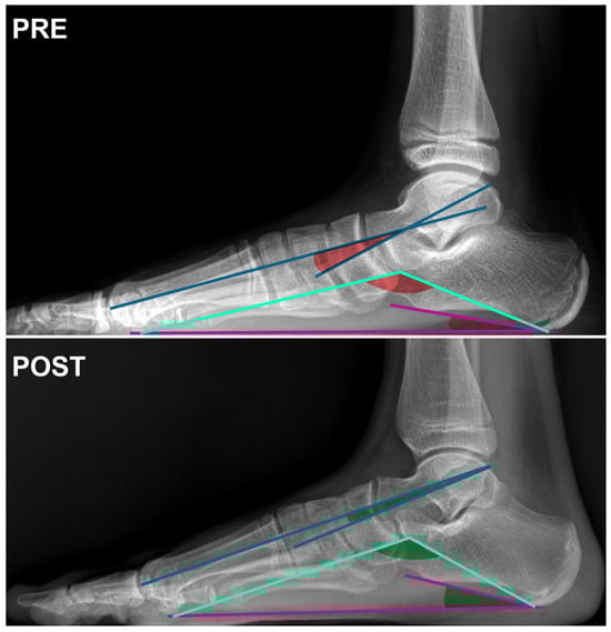 Lateral X-ray view of the foot of an 11-year-old female patient at the time of surgery (PRE) and at the 6-month postoperative follow-up (POST). Angle subtended by the blue lines: Meary’s angle; angle subtended by the cyan lines: Moreau-Bartani’s angle; angle subtended by the purple lines: Calcaneal Pitch angle.