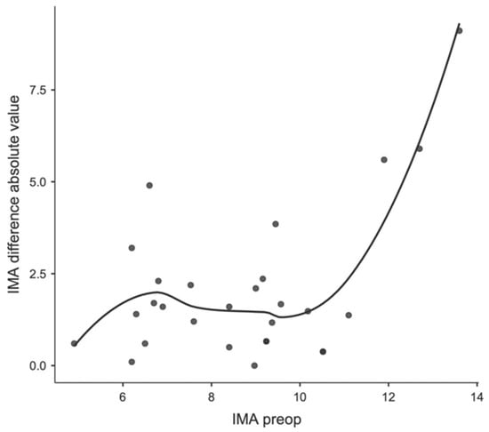 Locally estimated scatterplot smoothing between preoperative IMA and IMA change at the postoperative control, expressed as absolute values.