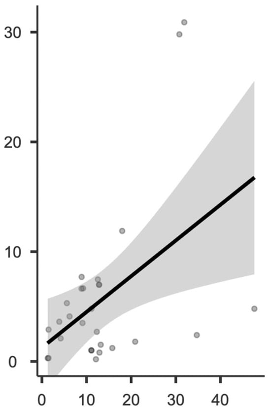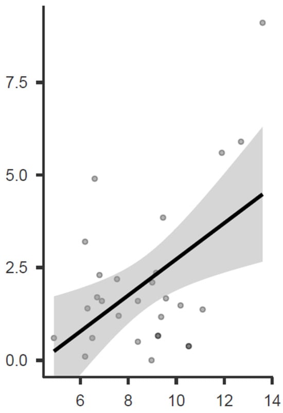 Regarding a possible correlation between preoperative values and first ray-related angles, a significant correlation was observed between the preoperative IMA and the change in IMA before and after surgery (see Figure 7 and Figure 8), as well as between the preoperative HVA and the change in HVA before and after surgery (Figure 9 and Figure 10).