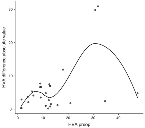 Locally estimated scatterplot smoothing between preoperative HVA and HVA change at the postoperative control, expressed as absolute values.