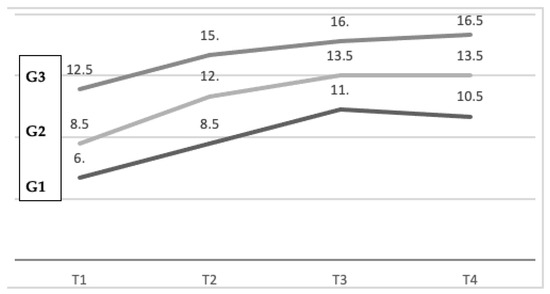 First, there was a significant group effect in semantic memory recall, with group G3 (augmented movement group) systematically getting better scores compared to G1 (freeze group); better performances were observed in G3 compared to G2 (minimal spontaneous movement group) only at the first timepoint. Our results build on findings from other authors, such as [9], that observed how higher rates of gross motor activity positively predicted phonological working memory performances for children with ADHD in experimental conditions, or [10], who obtained similar results in another working memory task. They suggested that being able to move may lead to optimal arousal and performance improvement in children with ADHD. Moreover, in G1, there was an imposition of staying still. Note that this mode of learning is often observed at school. The results are also aligned with other authors that showed how, because being instructed not to gesture is itself a cognitive load, subjects remember fewer items [20]. The act of gesturing lightens learners’ cognitive load, allowing subjects to work harder on the task and perhaps change the representation of the task [10,12].
