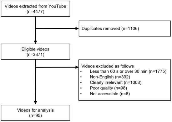 The exclusion criteria included videos that were duplicates, unavailable, not in English, and irrelevant, for example, those containing game suggestions or promotional materials for a clinic. Additionally, videos lacking verbal instructions or explanations in scripts were deemed to be of poor quality and excluded, along with those with a duration of less than 60 s or longer than 30 min. Figure 1 presents a flowchart outlining the video selection process.