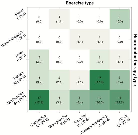 Confusion matrix between types of neuromotor treatment modalities and exercises. The higher the percentage the occupies, the darker the shading used for visualization. Therapeutic types, such as Rood, Vojta approach, and aerobic, warm-up, and cool-down exercise, which were not represented in any of the videos, were excluded from the visualization.