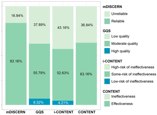 Table 3 presents the results of the therapeutic quality of programs based on i-CONTENT, CONTENT, and CERT. The mean score of i-CONTENT was 3.88 ± 0.11 out of 7. According to i-CONTENT, 43.16% of the videos were at high risk of ineffectiveness, while 52.63% and 4.21% had some or a low risk of ineffectiveness, respectively (Figure 3). Specifically, only two videos (2.1%) satisfied the item “type and timing of outcome assessment”. Furthermore, items related to safety (31, 32.6%) and dosage (34, 35.8%) of the program scored less than half the satisfaction rate, contrasting with other items related to patient selection, types of programs, and adherence.