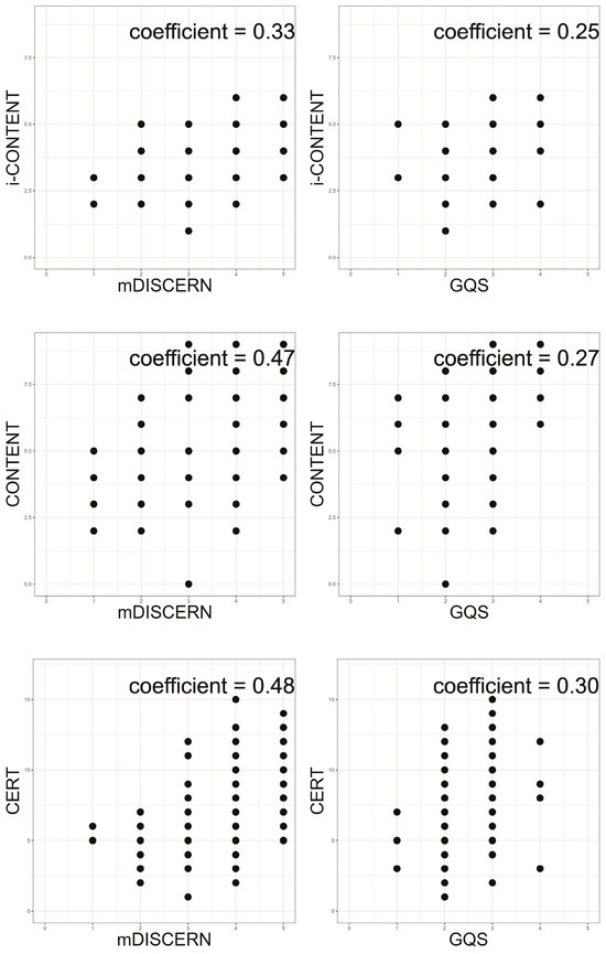 Correlation plots for the qualitative assessments of video content and therapeutic programs. Abbreviations: mDISCERN, modified DISCERN; GQS, Global Quality Scale; i-CONTENT, International Consensus on Therapeutic Exercise and Training; CONTENT, Consensus on Therapeutic Exercise Training; CERT, Consensus on Exercising Reporting Template.
