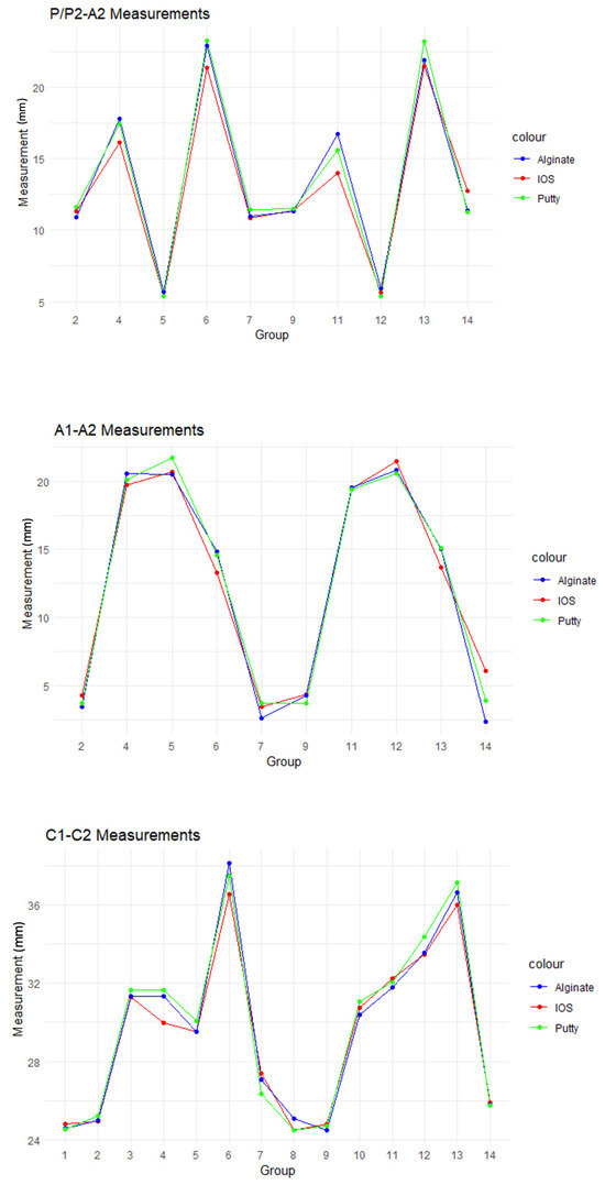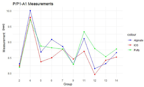 For each of the 14 groups of digital models, a line graph represents six linear and one angular measurement for the alginate (Alg), IOS, and putty models (Figure 4). Most groups have a significant degree of similarity in their measurements since the coloured lines that depict each group’s putty, IOS, and alginate are almost precisely parallel. P/P1-A1 had the maximum measurement variation. Still, the degree of deviation was not statistically significant.