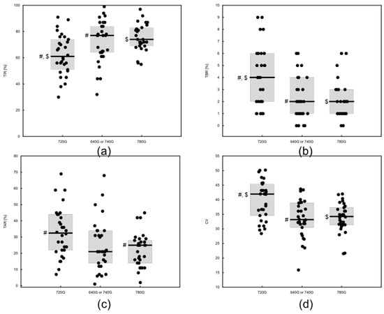 | Group Indices | Medtronic 720G without PLGS | Medtronic 640G or 740G with PLGS | Medtronic 780G | p Value |