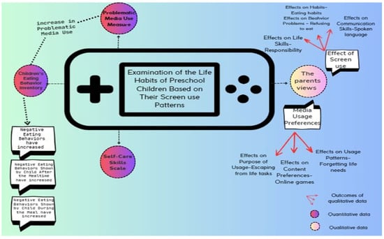 Quantitative and qualitative research methods have some limitations. Searches to overcome these limitations have led to the mixed research approach. Qualitative and quantitative research designs were used together in this study, which was structured in accordance with the mixed research approach. The main idea in choosing this method is to save the research from the limitations of the qualitative and quantitative approaches and benefit from their strengths. In this way, answers to the research questions were sought with different data collection methods and different data collection tools. The quantitative data for the study were collected using the Problematic Media Use Measure, the Children’s Eating Behavior Inventory, and the Preschool Children (36–72 months) Self-Care Skills Scale—Teacher Form. For gathering qualitative data, semi-structured interview forms conducted with parents were used.