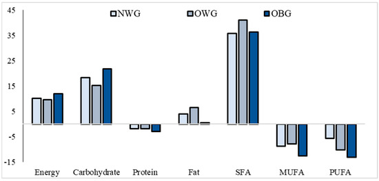 Percentage of difference in energy/macronutrients dietary intakes and estimated needs among children according to body composition. Notes: MUFA, monounsaturated fatty acids; NWG, normal-weight group; OBG, obese group; OWG, overweight group; PUFA, polyunsaturated fatty acids; SFA, saturated fatty acids.