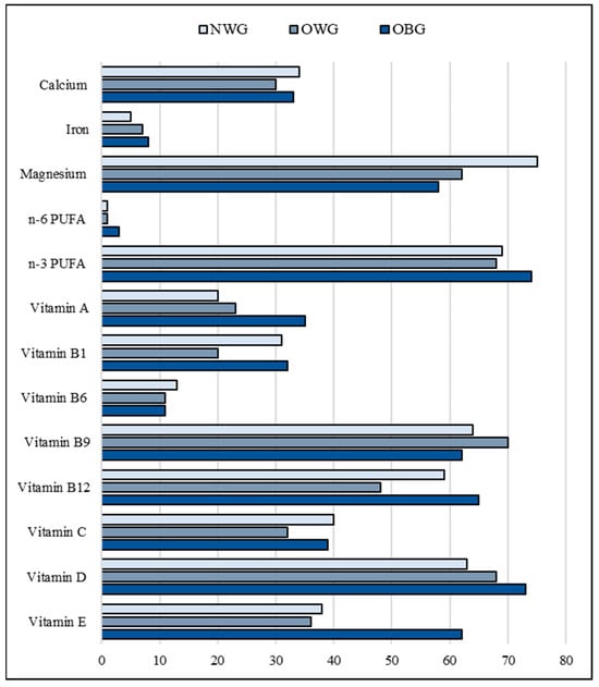 Selected micronutrient deficiency rates in children according to body composition. Notes: NWG, normal-weight group; OBG, obese group; OWG, overweight group; PUFA, polyunsaturated fatty acids.