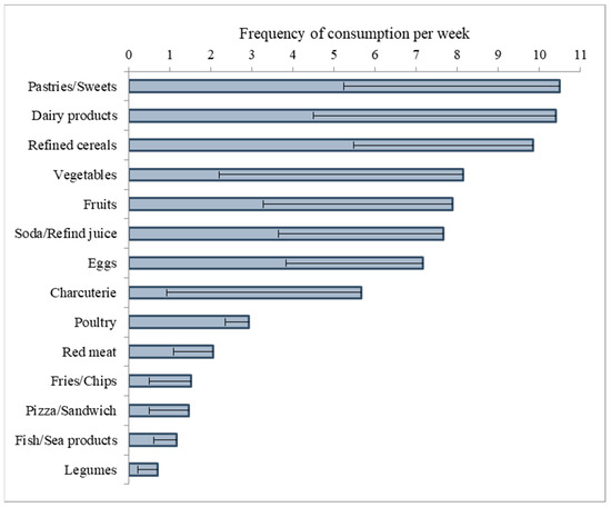Almost all overweight/obese children consume milk/dairy products, refined cereals/pasta, pastries/sweets, and soft drinks at least once daily. Most children consume vegetables and fruits daily, but they often eat one or two servings of each group, daily. Most children eat eggs daily, meat or poultry more than twice, and fish once, weekly. Most overweight/obese children consume fries, chips, pizza, and fast foods at least once per week. Finally, the consumption of legumes is low in most of these children (Figure 3).
