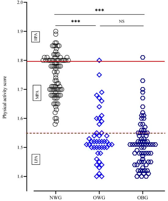 Distribution of PA score in children according to body composition. Notes: HPA, high PA; LPA, low PA; MPA, moderate PA; NWG, normal-weight group; OBG, obese group; OWG, overweight group. ***: p < 0.001, NS: p > 0.05.