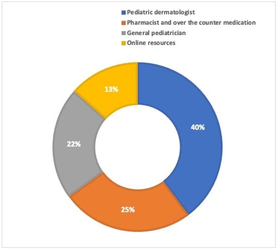 The majority of the participating parents (148, 39.8%) sought advice from a specialist, particularly a pediatric dermatologist, regarding their child’s skin health. This was followed by consulting a pharmacist and using over-the-counter medicine (94, 25.3%), seeking guidance from a general pediatrician (80, 21.5%), and utilizing internet resources (50, 13.4%), as shown in Figure 2.
