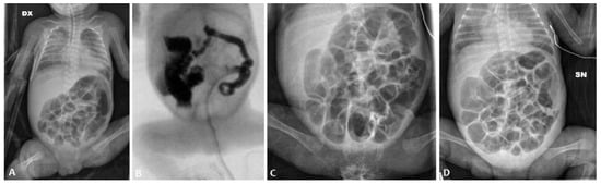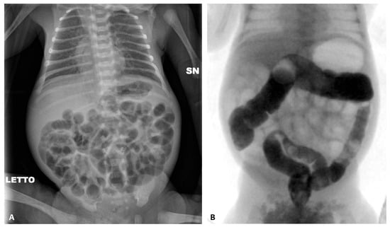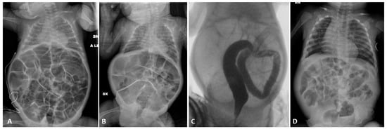 A female neonate was born after a preterm premature rupture of membranes longer than 24 h. The mother received both systemic antibiotics and steroid prophylaxis. An emergency cesarean section was performed at 26 weeks + 3 days of GA because of a non-reassuring fetal heart tracing. The birthweight was 870 g (+0.40 SDS, appropriate for the gestational age). The Apgar score was 5 at the 1st minute and then she needed intubation, receiving two surfactant doses afterward. The patency of the ductus arteriosus was successfully treated using two doses of paracetamol. She did not pass meconium either spontaneously or after enemas during the first 72 h of life. A minimal enteral feeding with donor human milk was started within the 3rd day of life, but she presented biliary gastric residuals, abdominal distension, and vomiting. An abdomen contrast X-ray performed on the 8th day of life revealed the presence of intestinal obstruction (Figure 4A). Therefore, she was referred to our NICU for a surgical evaluation.