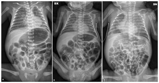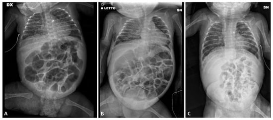 Abdominal X-ray of patient P2 on the 36th day of life (A); persistent abdominal distension on the 86th day of life (B); and abdominal X-ray after the NAC treatment (C).