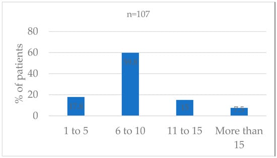 All 107 patients had at least one pain assessment in the previous 24 h. The median number of assessments per patient in the 24-h timeframe was 8 (range 1–22) (Figure 1).