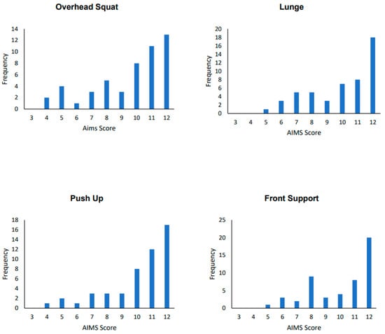 Prior to performing each skill, the participants observed movement demonstrations and received verbal instruction related to the key points for each movement related to the scoring criteria [20]. After this and in line with prior work describing the administration of the AIMS, participants were permitted to practice four to five repetitions of the movements. Following familiarisation (1–2 min/movement), participants performed two sets of four repetitions of each movement. During administration and congruent with guidelines for administration for the AIMS [20], only questions relating to assessment protocol (e.g., number of repetitions) were answered during the assessment; encouragement but not skill-related feedback was given [17,24]. The first set was performed and video-recorded (Sony HDR-CX405, Sony, Weybridge, UK) in the frontal and sagittal plane. As per prior guidelines for administering the AIMS, participants were given 10 to 15 s between sets and 4 to 5 min between tasks. Subsequent scoring of the AIMS was performed retrospectively from the video footage via Quintic Biomechanics analysis software v21 (Quintic Consultancy Ltd., Coventry, UK). Raters were permitted to pause and rewatch the footage as many times as required to complete their scoring.