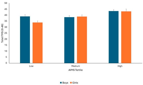 For total FMS, ANCOVA controlling for maturation indicated a significant AIMS tertile by sex interaction (F1,82 = 3.372, p = 0.039, Pη2 = 0.078). Bonferroni post hoc pairwise comparisons indicated that boys had significantly better FMS compared to girls in low AIMS tertile (p = 0.001). There were no significant differences in FMS scores between boys and girls in the medium or high AIMS tertiles (Both p > 0.05). However, there were significantly better total FMS scores for girls in the medium and high AIMS tertiles, compared to the low (both p = 0.001) and between girls in the medium AIMS tertile, compared to girls in the high AIMS tertile (p = 0.001). For boys, there was no significant difference in total FMS score between the low and medium AIMS tertiles (p > 0.05), but boys in the high AIMS tertile had significantly better total FMS scores compared to boys in the medium and low AIMS tertiles (both p = 0.001). Maturation was not significant as a covariate (p > 0.05). The mean ± SD of total FMS scores split by sex and AIMS tertile groups is presented in Figure 2.