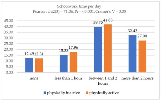 In the current study, we observed a progressive increase according to age in the number of subjects who spend more than 2 h per day on homework, which practically doubles from primary school to high school (23.39% vs. 50.26%), which seems to reflect that a greater amount of this type of activity is carried out as the educational cycle progresses. There is research showing the impact of time spent on homework reducing formal and free time for physical activity [], since, among other factors, more hours are dedicated to homework as the grade increases []. However, our study reflects that this behavior does not seem to determine being physically active by itself. In addition, there are recent studies that show how physical activity at these ages could benefit academic performance, so it seems advisable to combine them [,,,].