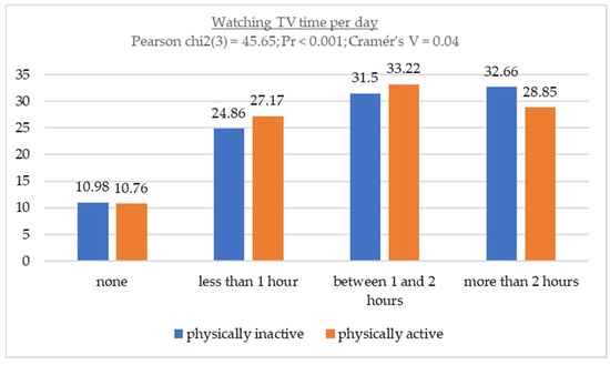 Figure 2 shows the relationship between TV viewing time and physical activity level. Furthermore, when examining the relationship between these sedentary behaviors and IPAQ-SF responses according to WHO recommendations, it became clear that the proportion of time spent in each category was very similar between physically active and physically inactive individuals.