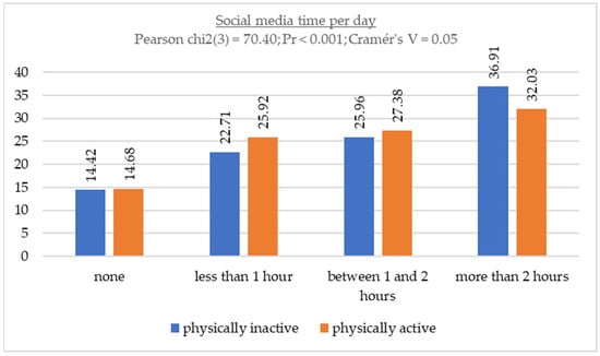 Figure 3 illustrates the relationship between time spent using social media and physical activity levels. Furthermore, considering the relationship between these sedentary behaviors and responses to the IPAQ-SF in accordance with WHO recommendations, the results suggest that there is minimal difference in the percentages of time spent between physically active and physically inactive individuals.