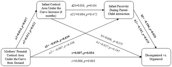 Mothers’ prenatal cortisol (AUCg) significantly predicted infant cortisol (AUCi) in the unadjusted (p < 0.02) and adjusted (p < 0.03) analyses, but infant cortisol (AUCi) did not significantly predict disorganized versus organized attachment patterns in either the unadjusted or adjusted analyses (p > 0.05; Figure 2 and Figure 3). In the unadjusted analyses, mothers’ prenatal cortisol (AUCg) significantly predicted both passivity (p < 0.04) and compulsivity (p < 0.02) among the infants during parent–child interactions, and passivity (p < 0.03) and compulsivity (p < 0.04) predicted disorganized versus organized attachment (Figure 2 and Figure 3). Following adjustment for relevant covariates, mothers’ prenatal cortisol (AUCg) no longer predicted children’s passivity in parent–child interactions (p > 0.10; Figure 2), but it continued to predict children’s compulsivity (p < 0.02), which, in turn, predicted disorganized versus organized attachment (p < 0.05; Figure 3).