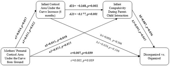 When combined in serial mediation: (1) mothers’ prenatal cortisol (AUCg) predicted infant cortisol (AUCi), (2) infant cortisol (AUCi) predicted infant compulsivity (but not passivity) during parent–child interactions, and (3) infant compulsivity predicted disorganized versus organized attachment (Figure 2 and Figure 3). However, all 95% bootstrap intervals were insignificant, suggesting that the indirect effects were not statistically significant (Table 2 and Table 3).