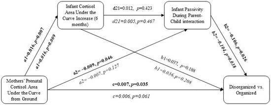 Indirect effects of mothers’ prenatal cortisol residualized on gestational age at the time of cortisol data collection through infant passivity on child attachment (disorganized versus organized).