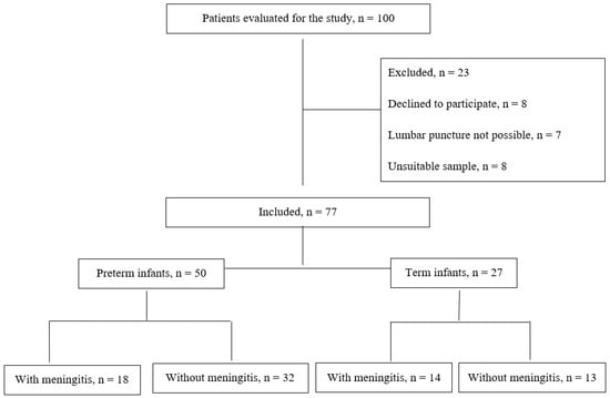 The flow chart of the patients included in the study is shown in Figure 1. Fifty patients were premature (mean ± SD; 31.7 ± 3.1 weeks), and twenty-seven were term (mean ± SD; 38.2 ± 0.9 weeks). Fourteen (52%) term babies and eighteen (36%) preterm babies were diagnosed with meningitis by CSF examination. Fourteen (77%) preterm neonates’ and thirteen (93%) term neonates’ CSF protein amount diagnosed with meningitis fulfilled the diagnostic criteria. Fifteen (83%) preterm neonates’ and four (29%) term neonates’ CSF white blood cell count diagnosed with meningitis fulfilled the diagnostic criteria. Sixteen (89%) preterm neonates’ and six (43%) term neonates’ CSF glucose levels diagnosed with meningitis fulfilled diagnostic criteria.