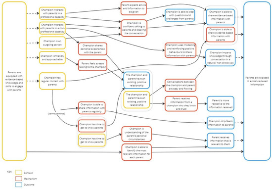 To investigate the impact of differing contexts of the champion–parent interaction, the champion–parent relationship, and the effects of champion’s personal characteristics on the sharing of evidence-based information, we adopted a realist-informed approach [68] for generating hypotheses within the next stage of analysis. Realist evaluation recognises the influence of socio-historical context on how people use and respond to programmes: things do not simply “work” or “not work” but may work some of the time, for certain people, in certain situations; “what works, for whom, under what circumstances, and how?” [69]. We identified and set out the contexts and mechanisms by which community champions achieved their aims and expressed these in terms of Context–Mechanism–Outcome configurations (CMOcs; [70]). Together, these CMOcs provide us with a more detailed programme theory of generative causation about when and how community champions pass on evidence-based information to parents. The CMO framework helps to reflect on the relationships between context, mechanisms, and outcomes in the programme through developing hypotheses about which mechanisms are likely to ‘fire’ in which contexts and the outcomes associated with these.