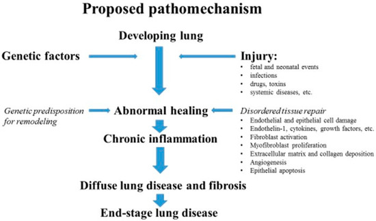 Recent years have seen a growing interest in creating a classification for pediatric diffuse lung disease, including interstitial disease. Such a classification would be instrumental in establishing a structured system for the differential diagnosis process, allowing for the recognition of nuances between adult and pediatric lung disease [4,5,6]. Pathophysiology is more complex in children, as damage occurs during lung growth and differentiation. After repeated injuries to the alveolar epithelial cells and capillary endothelium, an abnormal healing process leads to chronic inflammation, which responds to injury with alveolar–capillary wall thickness, blockade, and, in the end, restrictive respiratory dysfunction. The transformation of epithelial cells can lead to an increased production of collagen and other extracellular matrix components, potentially contributing to the development of progressive fibrosis [5,7]. A schematic representation of the proposed mechanism of diffuse alveolar damage and fibrosis in developing lungs aims to illustrate the complex processes involved in developing lung damage and scarring. Figure 1 provides a visual explanation of how diffuse alveolar damage leads to fibrosis, offering insights into the pathophysiology of these conditions.