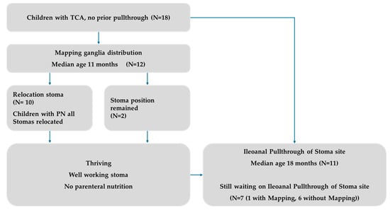 A total of 18 children with TCA without prior pullthrough received abdominal surgery during the study period of the 29 months between January 2022 and May 2024. We describe the pathway of care and the perioperative strategy for mapping the preparation for ileoanal pullthrough and the surgical strategy in primary pullthrough. Patient information: 5/18 female; children underwent mapping he children had a median of 4 (range 2–7) prior external surgeries; all children had a stoma when presenting to us. 6 (33%) children received parental nutrition; 12 children underwent a mapping of the ganglia distribution with us at a median age of 11 months (range 3–54), and in 10 of them, we relocated the stoma. There was a mean involvement of 15 (5–93) cm small bowel aganglionosis, with the remaining mean ganglionic small bowel having a length of 178 cm (110–254). A total of 11 children subsequently underwent straight primary ileoanal pullthrough of the stoma site at a median age of 16.7 months (10–133).