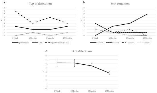Follow-up after primary transanal pullthrough in TCA: (a) stooling; (b) perianal skin condition; (c) number of defecations.
